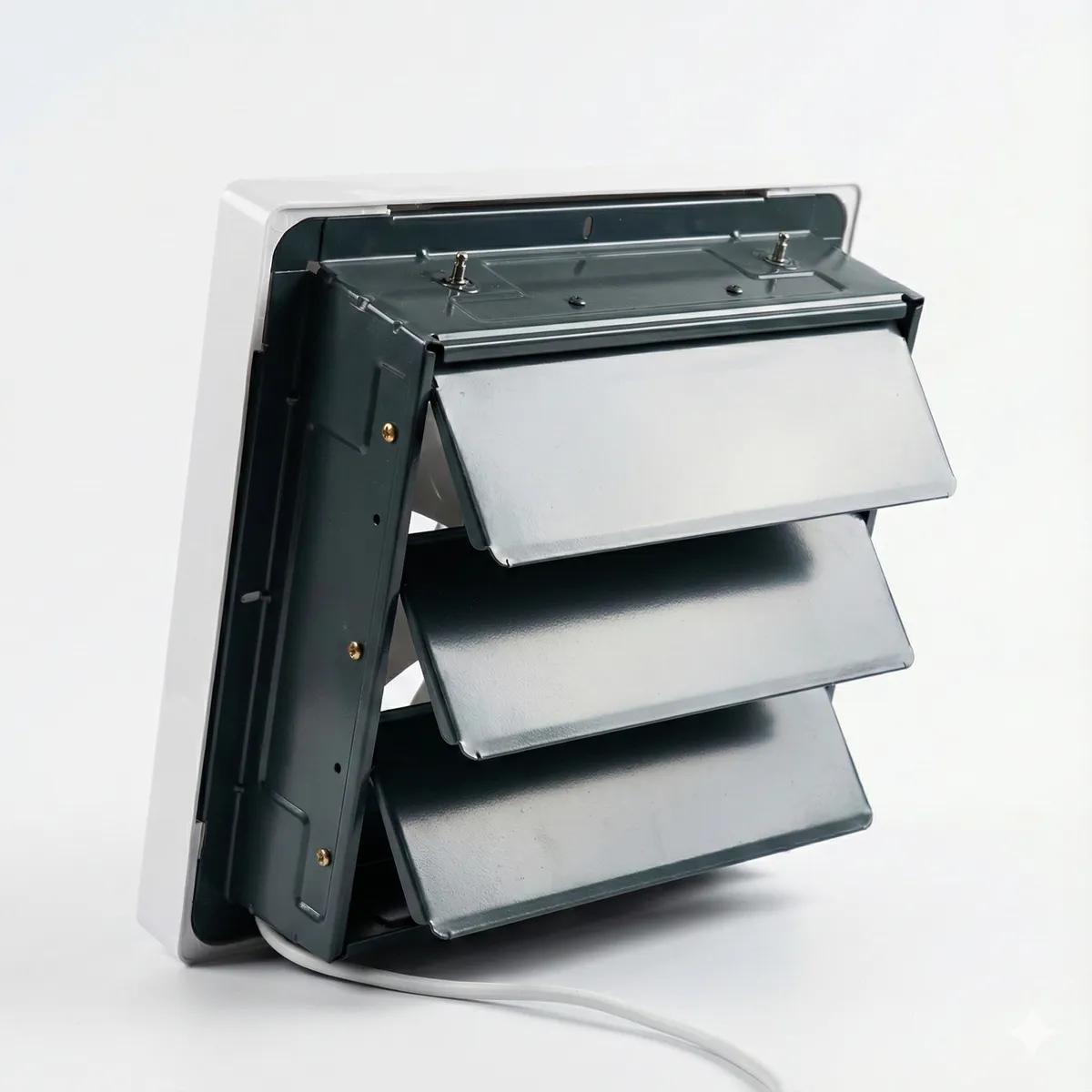 SISTEMA DE PERSIANAS METÁLICAS AUTOMÁTICAS: Cuenta con una cortina anti-retorno trasera. Las aspas metálicas se abren con la fuerza del aire al encenderlo y se cierran por gravedad al apagarlo.
